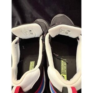 New Balance 515v3 sneakers in the 'Black Lime' colorway offer a classic silhouette with vibrant modern accents. These low-top lifestyle shoes feature a durable mesh and synthetic upper in black, highlighted by a lime green 'N' logo with blue trim. The multi-colored midsole incorporates red and blue panels for a bold aesthetic, while the NB Comfort Insert provides cushioned support for all-day wear. Finished with a textured rubber outsole and a striped heel pull tab, these sneakers blend athletic heritage with contemporary street style.