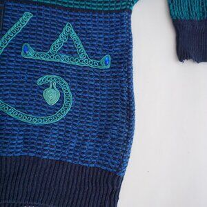 Deep navy and saturated teal weave together across this Bonnie sweater in a striking grid of geometric shapes, each one accented with luminous blue beadwork that catches the light like tiny jewels. The pattern feels architectural yet playful, with layered diamonds and looping motifs that give the surface a rich, textured story. The contrast between the dark base and the vivid teal creates a bold visual rhythm that feels artful without being overpowering, making it a standout piece for everyday wear or styled into something more elevated. This sweater fits beautifully into a Preppy aesthetic, where structured details and refined patterning create a polished, collected look that still feels expressive.