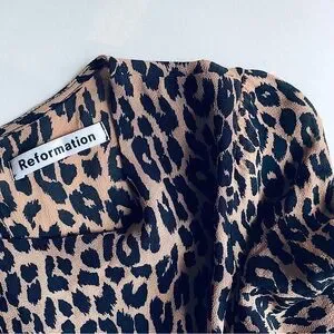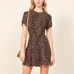 Fun, flirty animal print short sleeve dress by sustainable brand Reformation. Rusched short sleeves. In seam back zipper with center back Amazing for fall styles with tights, booties or knee high boots! Great condition!