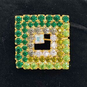 Add a touch of vintage glamour with this unique Monet brooch. Featuring interlocking squares, multicolored green rhinestones, and a crystal inset, this rare piece is sure to make a statement.