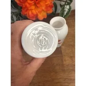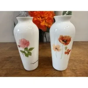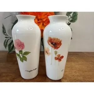 Lovely pair of Marjolein Bastin porcelain vases featuring her signature botanical artwork. One vase showcases soft pink garden roses and the other displays warm-toned poppies with delicate bee details. Both pieces have a smooth white porcelain base, crisp artwork, and the classic MB signature. Perfect for spring décor, gift giving, or adding gentle pastel charm to any room.