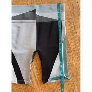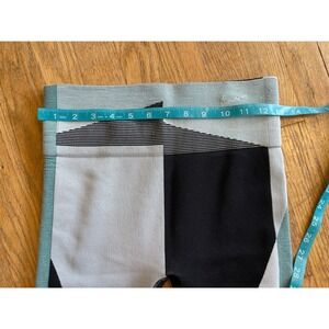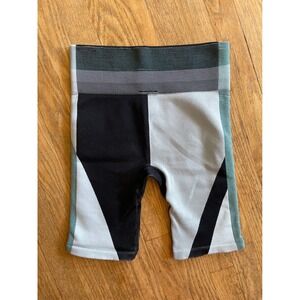 Keywords: Nike Dri-FIT, athletic shorts, biker shorts, color block, teal, black and white, performance wear, workout gear, gym clothes, seamless, compression