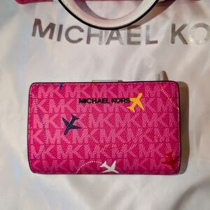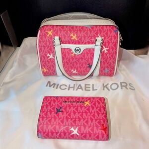 READY FOR SPRING!!! NWT Michael Kors fuschia Jet Set bag and matching wallet set. The crossbody is a small satchel with a 47" adjustable strap and drop handles. This set is brand new and never used so there are no call-outs. Comes with an MK-branded satin dust bag. The wallet retails for $258 and the bag retails for $425. 10/10