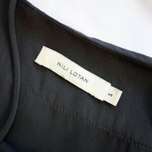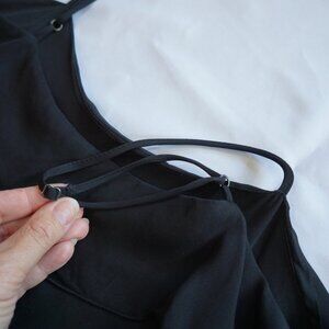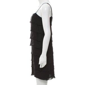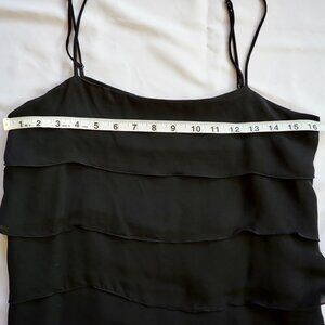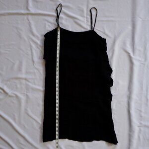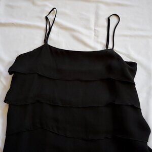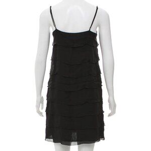 Chic and sexy silk dress from New York designer Nili Lotan. Black sleeveless tiered mini dress with adjustable straps, pull on style (no zipper). 100% silk, Made in NY.