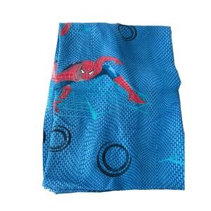 A vibrant blue twin size sheet featuring the iconic superhero Spiderman. This set showcases Spiderman in action poses amidst a dynamic backdrop of webs and circular motifs, perfect for a child's bedroom. The fabric is comfortable and durable, designed for everyday use. Ideal for a Spiderman themed bedroom or as a fun bedding upgrade for any young fan. Some fading present.
