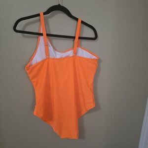 Orange One-Piece Swimsuit. Mesh Center with adjustable straps.