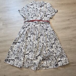 Stylish midi dress featuring a black and white comic print. Enhanced with a striking red belt. Perfect for adding a playful touch to your wardrobe.