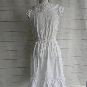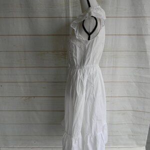 SANDRO COTTON EYELET LACE RUFFLE PEASANT BOHO DRESS SZ 38 US 6, GOOD USED CONDITION, GORGEOUS DETAILS, EYELET/LACE DETAIL, CAP SLEEVES. BUTTON NECKLINE. BOHO PEASANT MIDI FEEL. MEASURES FROM ARMPIT TO ARMPIT: 18" AND FROM TOP OF SHOULDER TO HEM: 42"