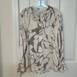 New with tag. Choose the cream Harri shirt, printed with an abstract leopard motif, to lend some life to daily edits. Its made to a loose fit with a granddad collar and a curved hemline. Hidden button down style. Super soft made of 100% viscose. Wear it with trousers and heels for a confidence stride.