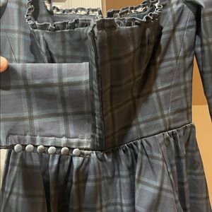 Chic blue checkered dress with long sleeves. Features a fitted bodice and flared skirt. Perfect for stylish outings. Only worn once.