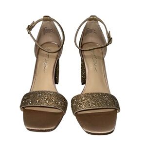 Betsey Johnson women's SB-Rina Heels light gold size 7.5m. Beautiful sexy shoe with a rubber sole, Ankle strap with a buckle closure, Sqaure open toe with a chunky heel.