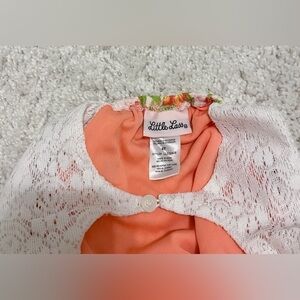 The coral-colored top features a charming floral design with delicate lace accents, adding a playful and feminine touch.