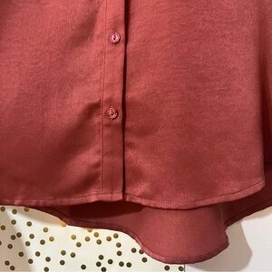 Elegant rust tunic with button-up front. Features a classic collar and chest pocket. Perfect for versatile styling. This is a thicker polyester shirt, well suited for spring or fall, or cool evening climates.