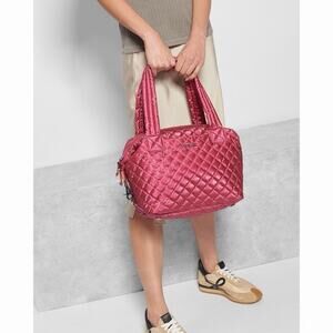 The MZ Wallace Sutton Deluxe Bag in Shiny Pink Peony Pearl is a stylish and practical tote bag designed for women. Featuring a zip closure, a crossbody strap handle in pink nylon, and silver hardware accents with pearls, this medium-sized bag is perfect for everyday use. The bag also comes with a long strap for added versatility and comfort. Made by the reputable brand MZ Wallace, this bag combines fashion and functionality in a chic design.
