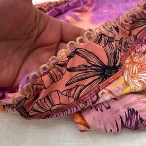 Stylish bikini bottoms with a vibrant floral design. Features shades of purple and orange.