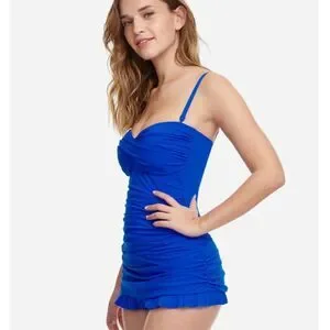 The Tutti Frutti Bandeau swim dress in Cobalt blue from Profile by Gottex is a super feminine looking style with ruching across the front and a short gathered skirt finished with a ruffle at the hem. The twist detail bust is lightly padded and there are optional adjustable straps for extra support.