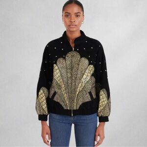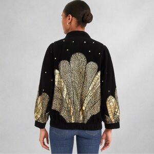 oversized shell-like motifs with textured gold accents, complemented by scattered embroidered gold dots for extra flair. With a zip front, elastic hem, and relaxed fit, this jacket blends luxury craftsmanship with standout retro style.