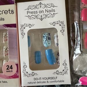 Set of designer and press-on nails in pink, blue, and floral designs. Includes 24 nails and a nail file.