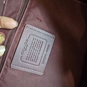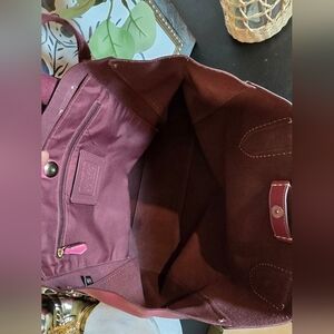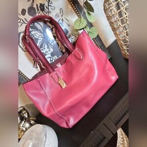 Stylish Coach tote in vibrant fuchsia leather. Ideal for daily use. Adds a bold touch to any look.