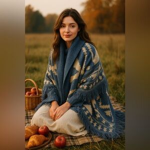 Keywords: boho chic, Western style, artisan knit, tapestry wrap, luxe fall layer, fringe poncho, cottagecore, coastal cowgirl, designer knitwear, cozy neutral, heritage style, elevated boho, winter wrap, statement piece, textured knit.