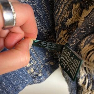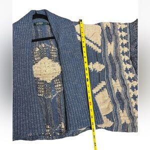 Stunning Ralph Lauren heavy knit poncho featuring a Southwestern tapestry motif, oversized ribbed shawl collar, and dramatic fringe trim. Premium wool/linen blend gives this wrap structure and softness — the perfect elevated boho/western/fall layering piece. Rare and excellent condition.