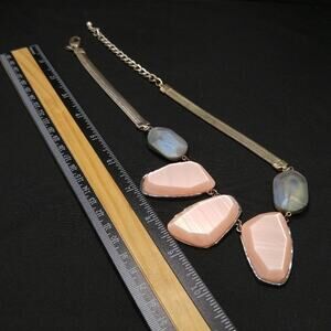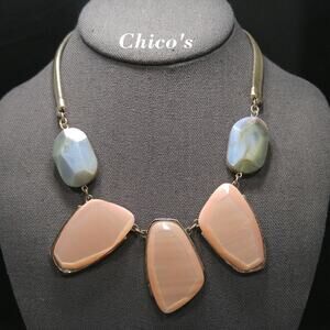 This is a pretty Chico's Women's necklace with an omega chain in silver tone and three pink Lucite pendants. The necklace also has two blue gray iridescent pendants. It is 20 inches in length with a lobster clasp and extension chain.