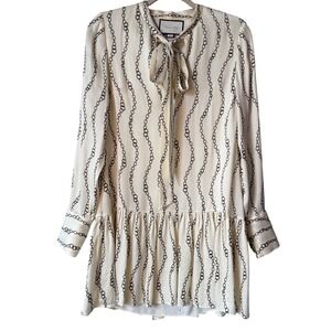 Chic Alexis designer mini dress featuring an ivory base with allover chain print. Designed with a flattering drop-waist silhouette, long sleeves with button cuffs, and a tie neckline. The lightweight cupro/viscose blend gives it a luxe drape with subtle sheen, while the lined interior ensures comfort. A perfect elevated mini for both day-to-night styling.