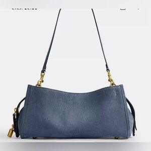 Chic Coach shoulder bag in navy suede. Features gold-tone accents and a sleek silhouette. Perfect for any occasion.