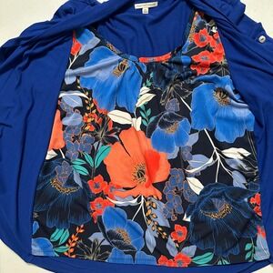 Notations women's shirt that looks like a vibrant floral print tank top and a complementary royal blue open-front cardigan. The top showcases a lively botanical pattern with large blue and orange flowers against a dark background. The three-quarter sleeve cardigan part offers a relaxed fit and features roll-tab cuffs with decorative buttons for adjustable styling.o