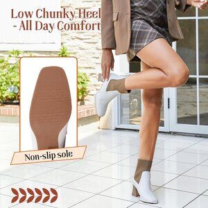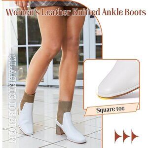 Women's Square Toe Ankle White Boots Low Block Heel Chelsea Mid Calf Booties