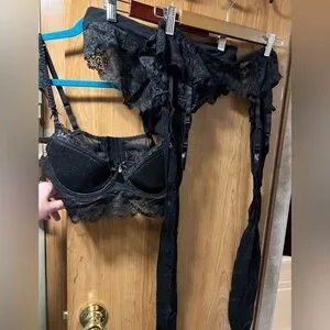 Sexy Black Lace Unlined Underwire Bra and Panty Set for Women Size 36B/Medium 🖤 Purchased on Amazon in 2020 and no longer available. The top, garter belt and thigh highs were worn once for a Boudoir Shoot. The bra has underwire with lace cups for some push up support and scalloped lace edges. The bra has adjustable straps to offer a perfect fit. The top has a little silver gemstone on it. The garter straps are adjustable. The thigh high stockings might have a few snags in them from when I wore them. Otherwise, it’s a great set for Valentine’s Day, Anniversaries, Holidays, or your own Boudoir shoot.