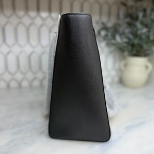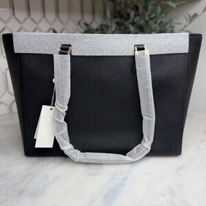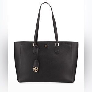 Keywords: tory burch tote, robinson tote, saffiano leather bag, designer work bag, laptop tote, structured handbag, black leather tote, luxury handbag, professional work bag