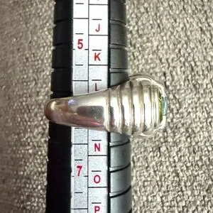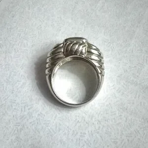Priced to sell! Elegant Judith Ripka sterling silver statement ring featuring a large faceted blue topaz center stone flanked by vivid green peridot accents. The gemstones are beautifully cut for maximum sparkle and set in Ripka’s signature ribbed sterling silver band with substantial weight and presence.