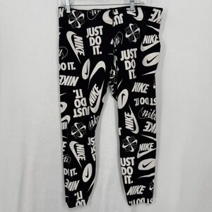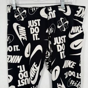 Nike women's athletic leggings in a bold all-over black and white print featuring the iconic "Just Do It" slogan and Swoosh logos. These comfortable and stylish leggings are perfect for workouts, lounging, or everyday wear.