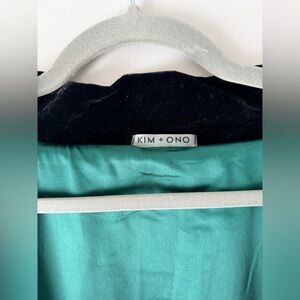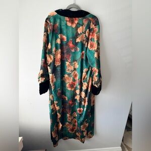 Luxurious floral robe featuring a vibrant green and velvet black trim. Excellent condition, but does not come with waist tie.