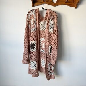 Embrace warmth and style with this chic crochet cardigan. Featuring a beautiful blend of pink and white, it's perfect for any occasion.