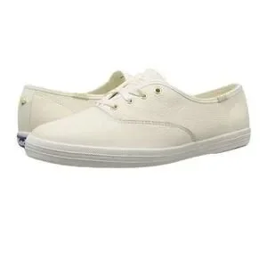 Kate Spade collaboration Keds Champion sneakers in a creamy white hue. These classic low-top sneakers offer a timeless style with a touch of elegance. The subtle texture of the leather adds a refined detail to the iconic silhouette. Perfect for casual outings, everyday wear, or adding a polished touch to a relaxed ensemble.