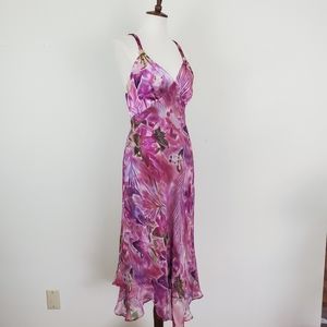 Donna Ricco New York 100% Silk midi dress with polyester lining. Gorgeous purple, pink and green floral print. Metal hardware loop details around base of straps. Straps can be worn cross back or classic halter style. Perfect for Spring! Only worn a couple times. The straps/ties do have a little fraying but not very noticeable when wearing. Otherwise excellent condition! Size 8