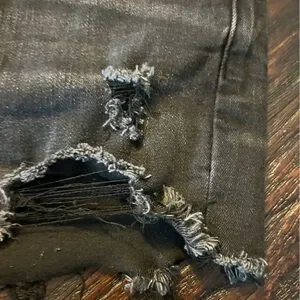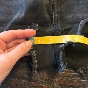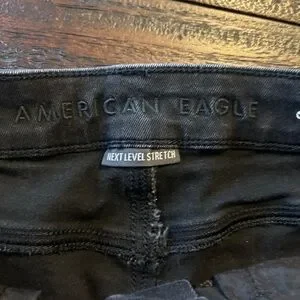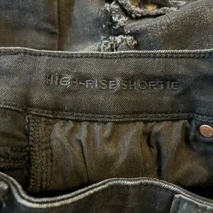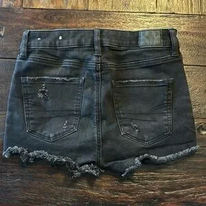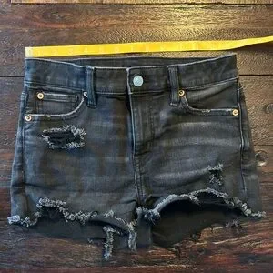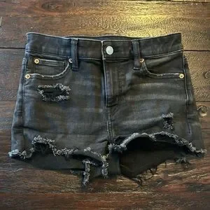American Eagle Outfitters Next Level Stretch Rise Shorties- Denim Shorts. Black with distressed details. Raw frayed hems.