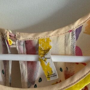 Free people high-low mini dress cage-style sides w/ low-cut keyhole back. Front hem runs past knees. Yellow piping accent with yellow painted flowers. Color scheme in yellows purples orange blues and greens. Size S petite