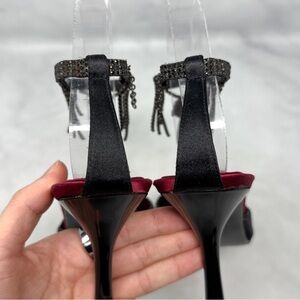adjustable ankle strap embellished with gunmetal rhinestone fringe