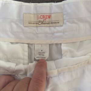 The product is a pair of J Crew White Shorts in classic twill city fit, designed as chino bottoms for women in size 8. These shorts feature a flat front, mid-rise, and a hook & eye closure for a comfortable and stylish fit. Made of cotton fabric, they are perfect for casual occasions with a plain white color and subtle logo accents. The chino style and city theme make them versatile for everyday wear or walking activities.