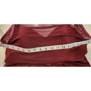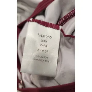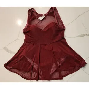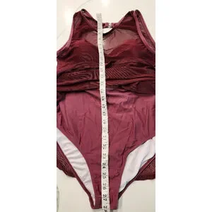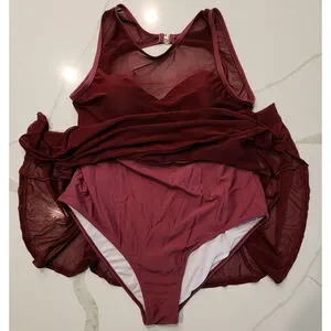 Women's one-piece swimsuit in a violet (burgundy/maroon) color (pic in black is for visual aid), in X-Large. It features a mesh overlay on the top and skirt, with a solid lining underneath. The swimsuit has a sweetheart neckline, adjustable straps, and a back clasp closure.