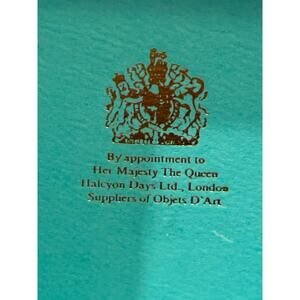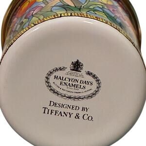 This is a beautiful and collectible vintage Halcyon Days enamel trinket box, specifically designed for and retailed by Tiffany & Co.. It comes with the added prestige of a Royal Warrant, as indicated by the base inscription: "By appointment to Her Majesty The Queen Halcyon Days Ltd., London Suppliers of Objets D'Art".