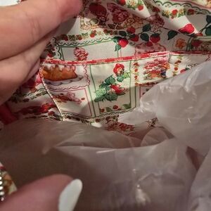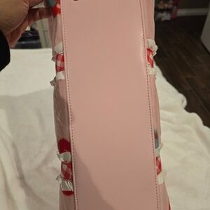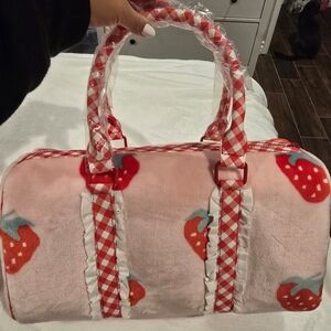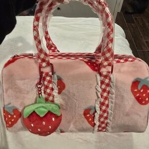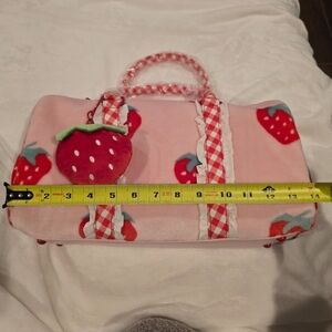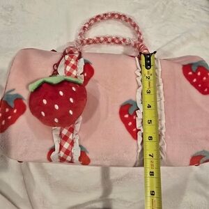 Cute pink travel bag with strawberry design. Features gingham accents and plush charm. Ideal for fun trips.