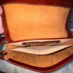 Features a structured silhouette with a fold-over ‘H’ flap, interior zip compartment, card slots, and slip pocket — ideal for documents, tablet, or travel use. Stunning cognac brown color with visible natural leather character and quality stitching throughout.