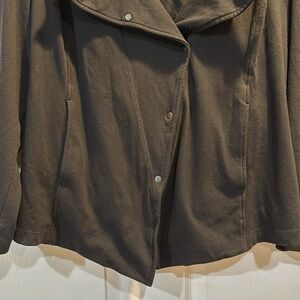 Gently worn Eileen Fisher Black Stretch Knit Moto Jacket women’s plus size 1X. Organic cotton/lycra blend, black, asymmetrical snap buttons up front, shawl collar, front slash pockets, ribbed knit sleeves, oversized fit. Great fall layering piece! Offers accepted!
