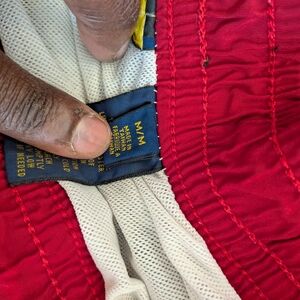 Vibrant red athletic shorts featuring a distinctive logo. Perfect for active wear.