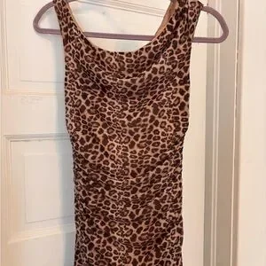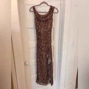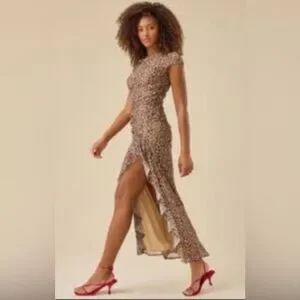 Brand new with original tags, never worn. Stunning brown & black leopard print mesh maxi dress from Altar’d State featuring a flattering ruched bodice and dramatic side slit. Soft, stretchy mesh fabric with lining for comfort and coverage.