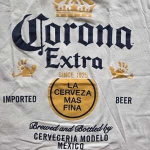 Stylish Corona Extra tee in cream. Features bold gold and black graphics. Ideal for casual wear.